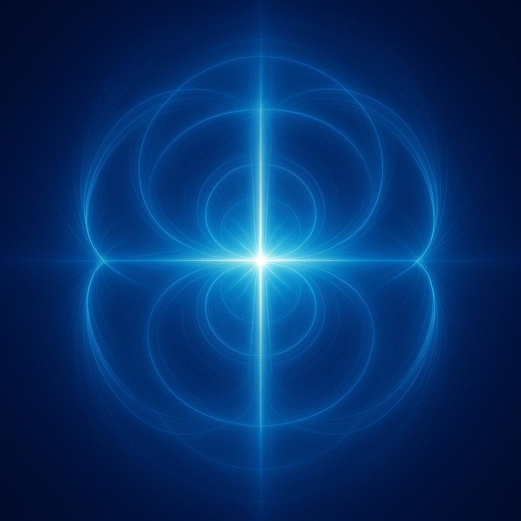 Im Zentrum des Symbols ruht ein geometrisches Kreuz aus Licht, umgeben von kreisförmigen Schwingungen, die Ordnung und Bewegung zugleich ausdrücken.